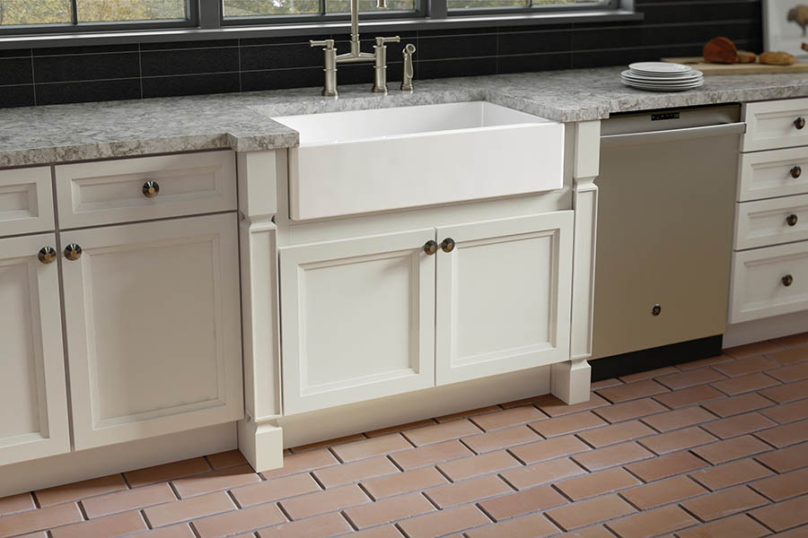 A painted grey finish like Mist helps bring out the cabinetry’s door and drawer styles – more so than stained wood grain. Choose light grey for a five-piece drawer front. Sure, it costs a bit extra, but you get the added value of more drawers – and the paint’s consistency across all doors and drawers lends a more finished appearance.